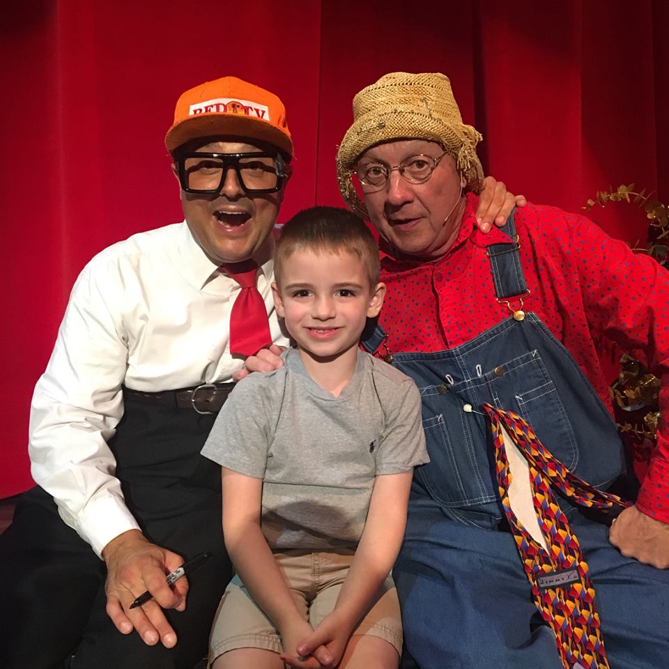 Okay, so the show starts and immediately he yells, like literally yells, “Mom, check out the lasers”! To which I replied with a loud whisper, “SHHHHHHH”! (The lasers kept him pretty entertained as they are on during a lot of the show). So the show begins and it is non-stop entertainment for 2 hours with a 20 minute intermission. And my 5 year old son loved it! He loved the comedy and faster songs, of course the slower numbers didn’t keep his attention as well (although those were some of my favorites). The slower songs seemed to go by pretty quickly so he didn’t start to act out during the slower numbers, thankfully! His favorite part was the comedy! He was laughing so loud through every comedy routine, even if he didn’t understand it, he thought it was hilarious! He loved Cecil and Herkimer and he got to take a picture with them at intermission, which of course made his day… and mine! At the end of the show the performers come out again to greet the audience, and since it was already so far past his bedtime we left as soon as the show was over. He was disappointed he didn’t get to say goodbye to his “friends”. I told him that we would go back again soon and he could see them again, that seemed to make him happy ๐